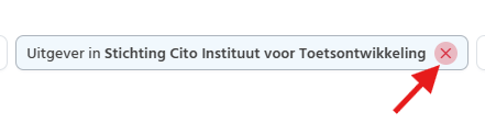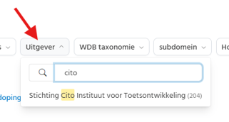 Klik op de gewenste filter om deze aan te passen. Er verschijnt een dropdown met de beschikbare waarden voor die filter. In deze dropdown kun je ook typen om de lijst met filterwaarden te verfijnen. We zoeken hier bijvoorbeeld naar de uitgever 'Cito'.