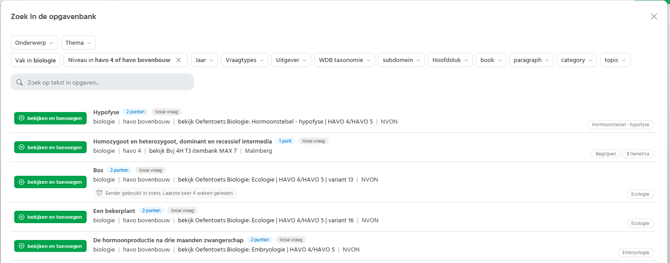 Je komt nu in de opgavenbank terecht. Hier kun je selecteren welke opgave(n) je aan je toets wilt toevoegen. Gebruik de beschikbare filters om snel de gewenste opgave te vinden; de filters voor het vak en het niveau zijn hierbij al automatisch voor je ingevuld.