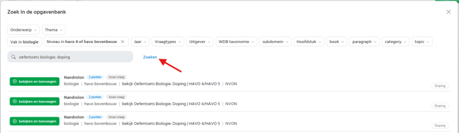 In de zoekbalk kun je zoeken naar specifieke toetsen waaruit je opgaven aan je toets wilt toevoegen. Typ de titel van de toets in en klik op 'Zoeken'; vervolgens verschijnen de opgaven die bij deze toets horen. Je kunt ook zoeken op de titel van een opgave of op (een deel van) de tekst die in een opgave voorkomt. Dit stelt je in staat om opgaven te vinden waarin specifieke begrippen voorkomen of waarin een bepaalde manier van uitwerken wordt gevraagd.
