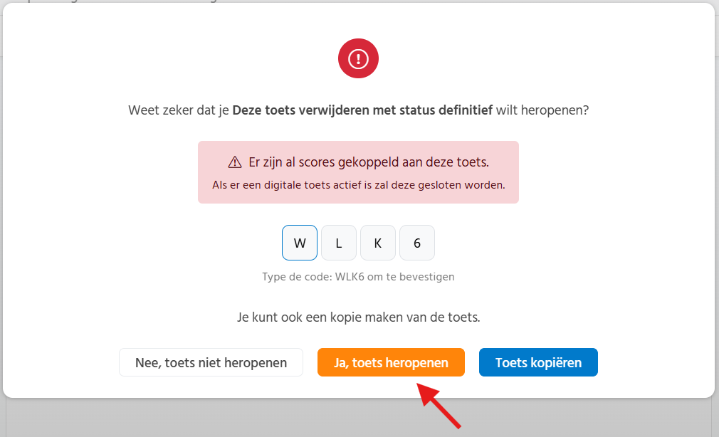 Vervolgens wordt er gevraagd of je zeker weet dat je de toets wilt heropenen, voer de code in als deze wordt gevraagd en klik op 'Ja, toets heropenen'.
