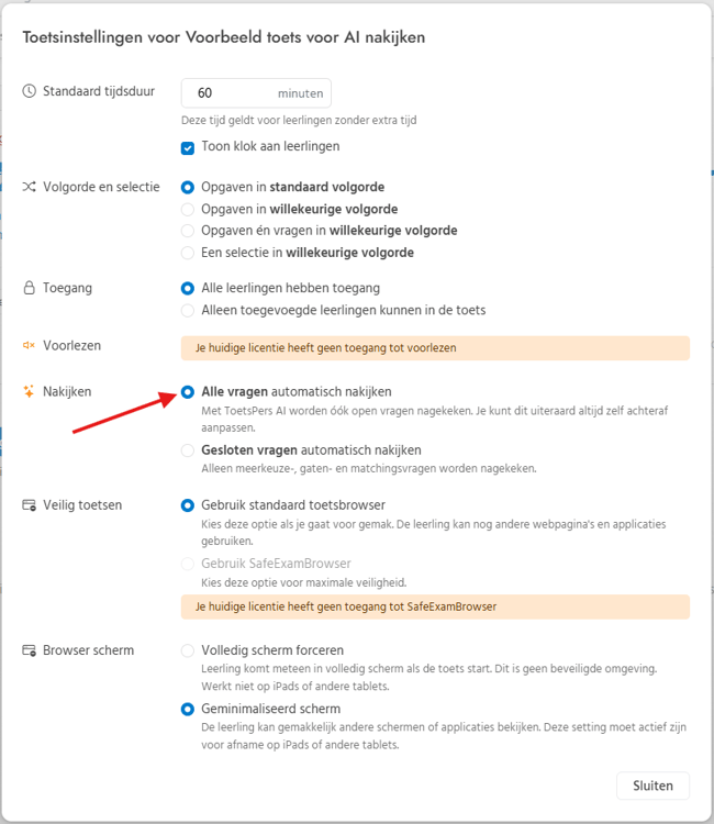 Controleer in de toetsinstellingen of de AI functie 'Alle vragen automatisch nakijken' is ingeschakeld. Als je geen licentie hebt voor deze functie, kun je alleen de meerkeuzevragen automatisch laten nakijken.