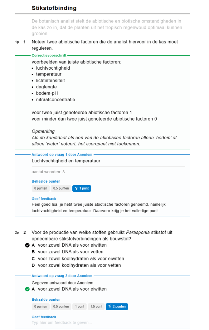 Daarna kun je per leerling de door AI nagekeken antwoorden bekijken. De sterretjes bij het behaalde puntenaantal geeft aan dat deze vraag door AI is nagekeken. Indien nodig kun je het puntenaantal aanpassen en (aanvullende) feedback invoeren voor de leerling.
