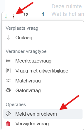 Klik op de drie puntjes links van het vraagnummer bij de betreffende vraag en selecteer vervolgens ‘Meld een probleem’.
