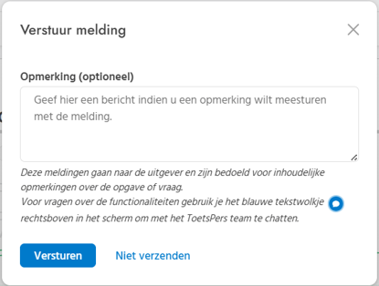 Je kunt vervolgens eventueel een toelichting geven en de melding indienen door op 'Versturen' te klikken. De melding is gemaakt en ToetsPers gaat ermee aan de slag.