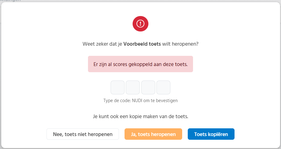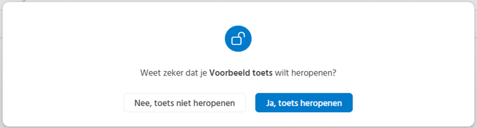 Als de toets nog niet is afgenomen wordt er gevraagd of je zeker weet of je de toets wilt heropenen, klik dan op 'Ja, toets heropenen'.