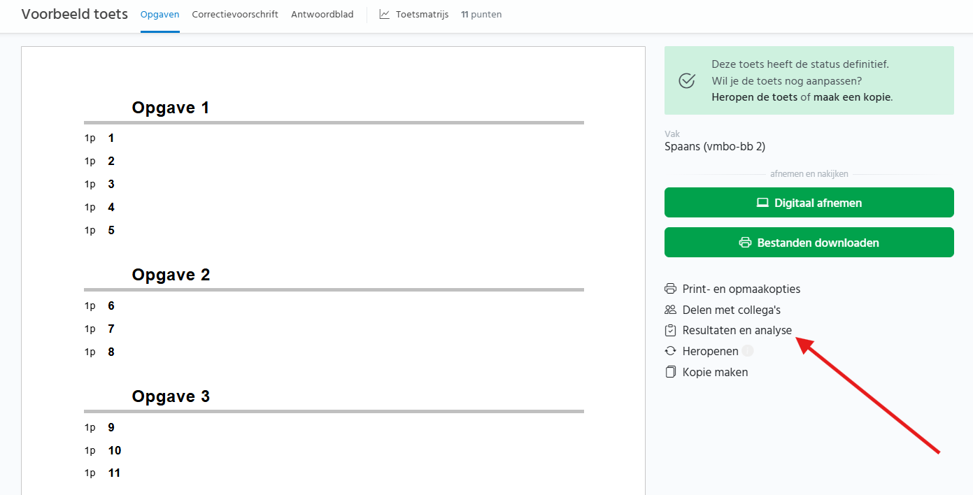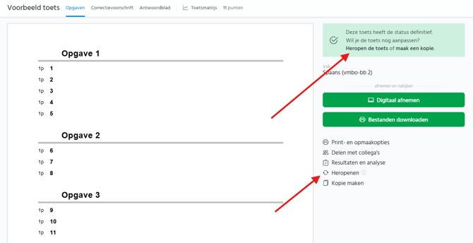 Wanneer een toets de status ‘definitief’ heeft kun je deze alsnog bewerken door in het scherm rechts naast de toets op ‘Heropenen’ of op 'Heropen de toets' te klikken.