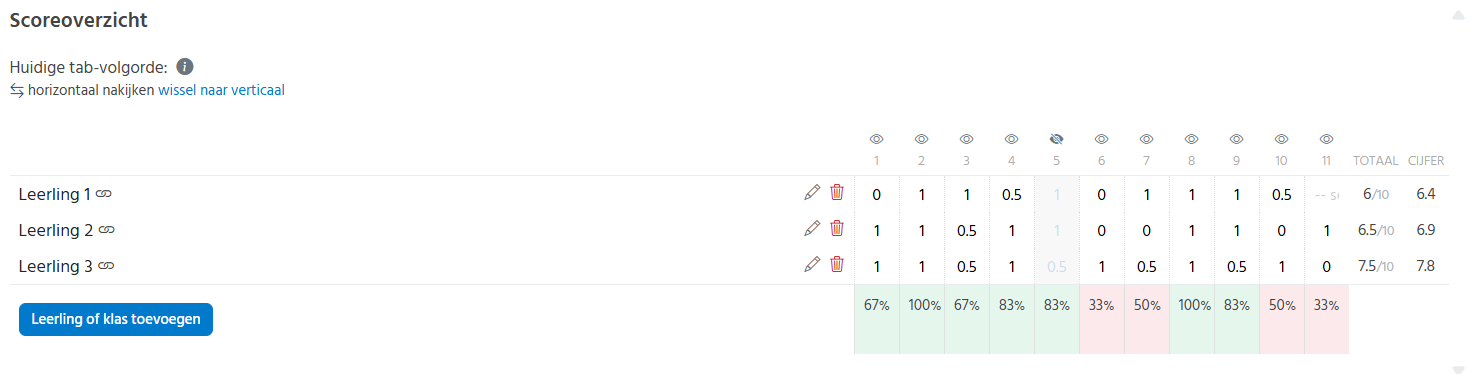 Je kunt in het scoreroverzicht eenvoudig vragen wel of niet mee laten tellen door op het oogicoon boven de vraag te klikken.