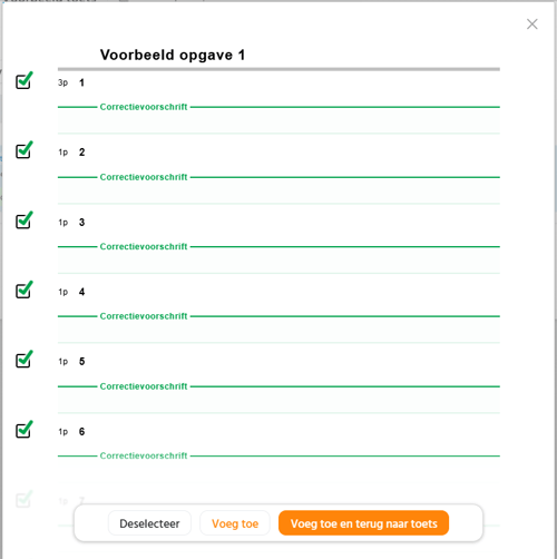 Vink aan welke vragen je uit de opgave wilt toevoegen (standaard zijn alle vragen geselecteerd). Klik daarna op ‘Voeg toe’ om de geselecteerde vragen toe te voegen. Je kunt vervolgens extra opgaven toevoegen aan je toets, of kies voor ‘Voeg toe en terug naar toets’ om de opgave direct toe te voegen en terug te keren naar de toets waaraan je werkt.