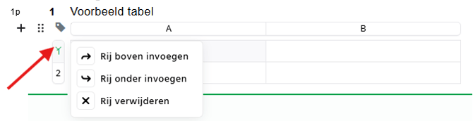Wil je een rij toevoegen of verwijderen? Klik op het pijltje van het rijnummer waar je een rij wilt toevoegen of verwijderen en kies vervolgens of je boven of onder deze rij een nieuwe rij wilt toevoegen, of dat je de geselecteerde rij wilt verwijderen.