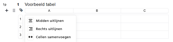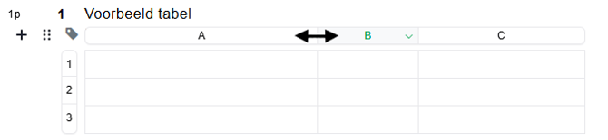 Als je klikt op ‘Tabel’, wordt er direct onder het plusteken een nieuwe tabel ingevoegd. Zodra je met je muis in een willekeurige cel klikt, worden de rijen aangeduid met nummers en de kolommen met letters.
