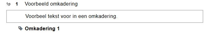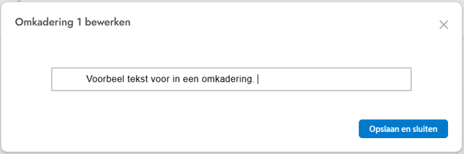Als je klikt op ‘Omkadering’, wordt er direct onder het plusteken een nieuwe omkadering toegevoegd. Hier kun je meteen beginnen met typen. In een omkadering kun je naast tekst ook een lijst, figuur, pagina-einde, geluidsfragment, video en tabel plaatsen. Staat alle gewenste informatie in de omkadering? Klik dan op ‘Opslaan en sluiten’.
