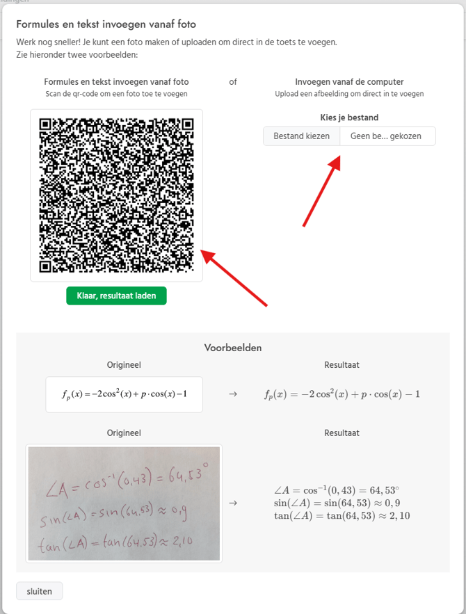 Als je een formule wilt toevoegen met behulp van een foto, klik je op ‘Formule uit foto’. Vervolgens kies je of je een foto wilt uploaden vanaf je telefoon of vanaf je computer. Kies je voor uploaden via je telefoon, dan scan je met je telefoon de QR-code die verschijnt en klik je na het toevoegen van de foto op ‘Klaar resultaat laden’. Kies je voor uploaden via je computer, dan sleep je de foto naar ‘Kies je bestand’ of klik je hierop om de foto te selecteren en klik je daarna op ‘Bestand uploaden’. De formule wordt daarna automatisch in de toets opgenomen.