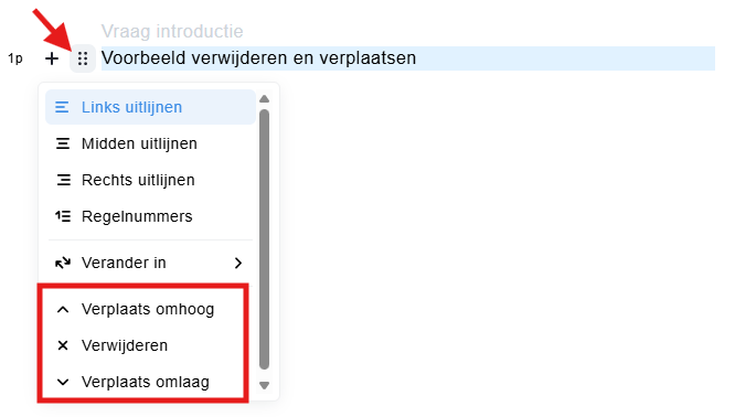 Wil je een stuk tekst of een van de andere hierboven genoemde elementen verwijderen of verplaatsen? Klik dan links naast het onderdeel dat je wilt aanpassen op de zes bolletjes en kies vervolgens of je het wilt verplaatsen (en zo ja, naar welke positie) of verwijderen.