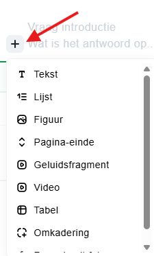 Als je in ToetsPers een toets aan het maken of bewerken bent en zelf de opmaak wilt bepalen, heb je hiervoor verschillende opties. Beweeg met je muis over het gedeelte waar je iets wilt toevoegen en klik op het plusteken; er opent dan een keuzemenu met de beschikbare opmaakopties.