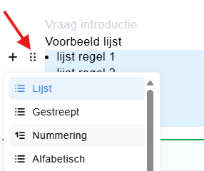 Je kunt kiezen uit verschillende soorten opsommingstekens: Lijst (zwarte bolletjes), Gestreept (streepjes), Nummering (genummerde lijst) en Alfabetisch (geordend op letters). Om het type opsomming aan te passen, klik je op de zes bolletjes naast de lijst en selecteer je het gewenste opsommingsteken.