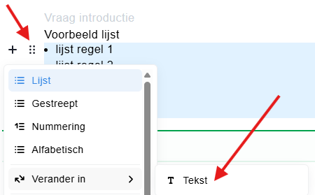 Wil je de lijst toch niet gebruiken en deze omzetten naar gewone tekst, klik dan opnieuw op de zes bolletjes naast de lijst en kies ‘Verander in > Tekst’. Het werkt ook andersom: je kunt bestaande tekst op dezelfde manier omzetten naar een lijst.