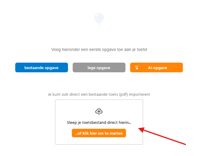 Om een PDF te importeren, maak je eerst een nieuwe toets aan in ToetsPers. Als je toegang hebt tot deze functionaliteit, verschijnt er een gebied waar je een PDF kunt naartoe slepen of via een knop kunt selecteren en uploaden.