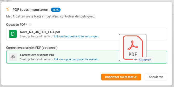 Als je ervoor kiest om een PDF bestand naar dit gebied te slepen, moet je eerst het opgavenblad naar deze plek slepen. Daarna kun je het correctievoorschrift naar de gevraagde plek slepen.