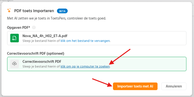 Upload dan vervolgens het PDF bestand van het correctievoorschrift en klik daarna op 'Importeer toets met AI' om het proces te beginnen.
