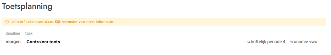 Je kunt ook naar de pagina Toetsplanning in ToetsPers gaan. Daar staan jouw taken overzichtelijk weergegeven. Als je een toets moet controleren, zie je dat daar bij jouw taken terug.