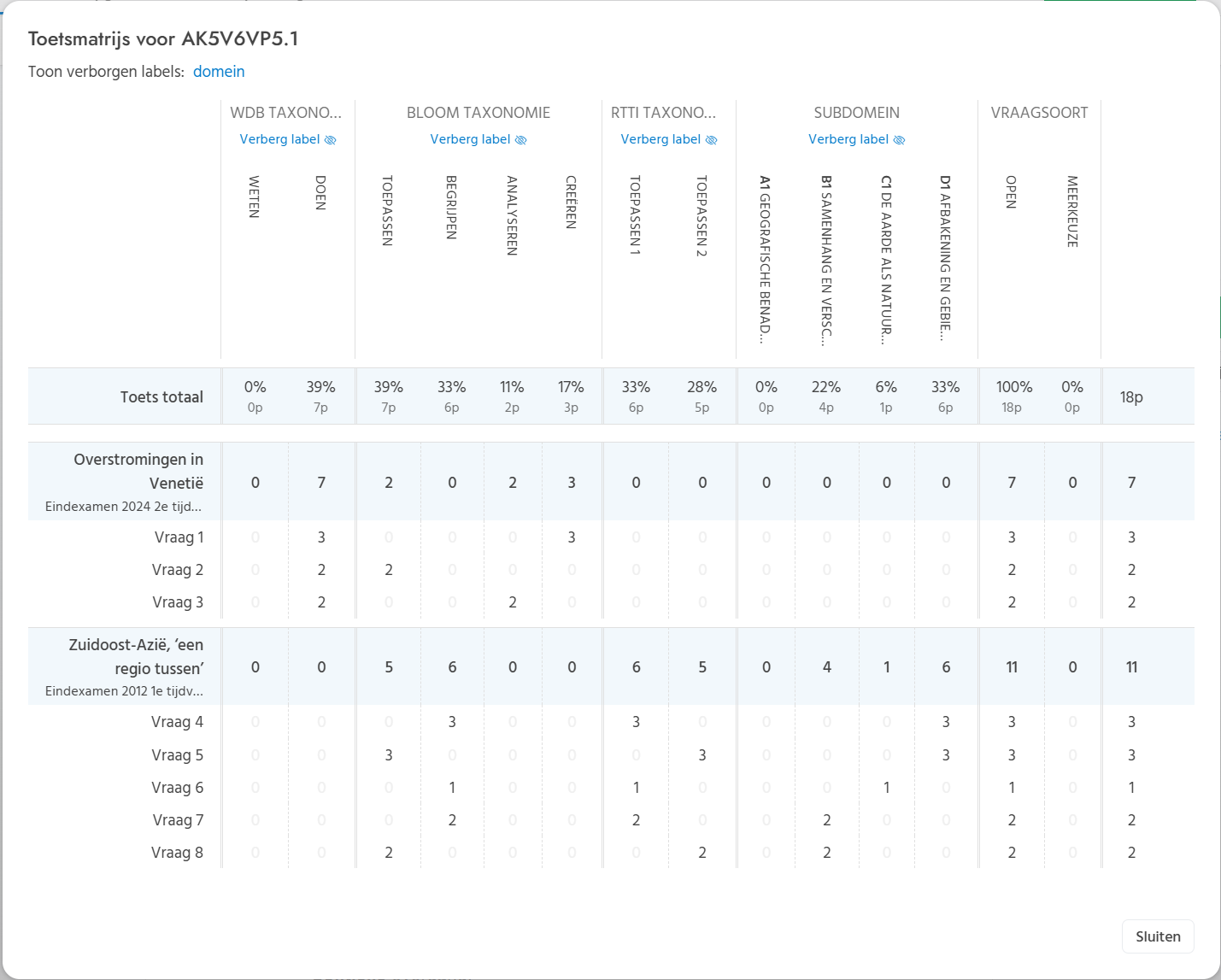 In de toetsmatrijs zie je welke (sub)domeinen en taxonomieën worden getoetst en hoeveel punten aan elk onderdeel zijn toegekend.