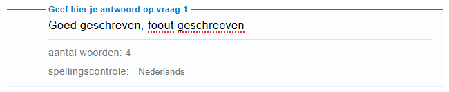 Wanneer de spellingscontrole is aangevinkt, zien leerlingen in de digitale toets dat de spellingscontrole actief is en in welke taal deze is ingesteld. Maakt een leerling een spelfout, dan wordt dit weergegeven met rode kringels onder het verkeerd gespelde woord.