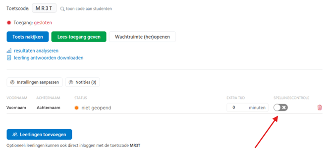 Wanneer alle toetsinstellingen naar wens zijn en de leerlingen zijn toegevoegd, kun je bij de leerlingen met recht op spellingscontrole deze functionaliteit activeren door het betreffende selectievakje aan te vinken.