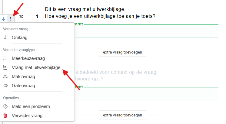 Bij een al bestaande vraag moet het vraagtype veranderd worden: Ga in de toets naar de vraag waarvoor je een uitwerkbijlage wilt toevoegen, en klik op de drie puntjes naast de vraag.